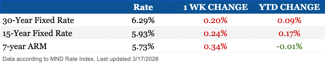 Mortgage rates jumped from 6.09% on March 10th to 6.41% on March 13th, their highest level in about seven months. The spike was driven by war-related inflation fears, higher oil prices, and weakness in the bond market. Rates eased back to 6.29% by Tuesday the 17th, but only after the worst three-day stretch since April 2025.